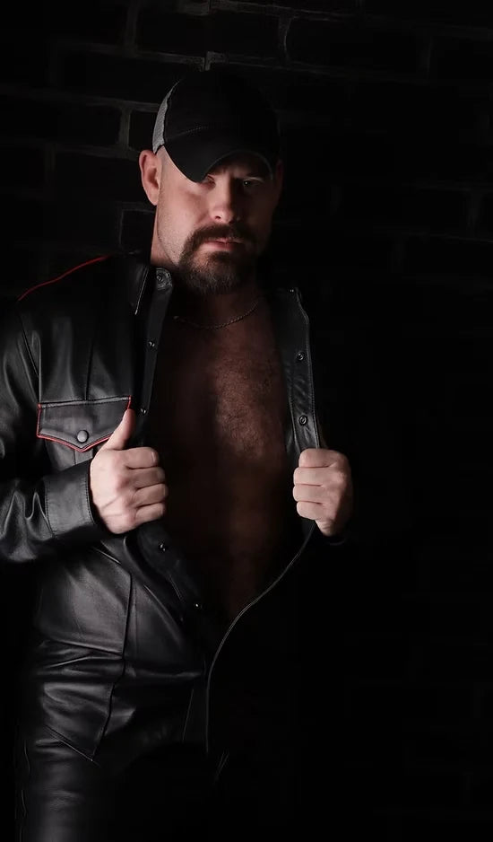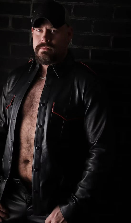 Long Sleeve Police Shirt with Contrast Piping Long sleeve police shirt has an accent of color around the front pockets, epaulets and cuffs. Choose the color piping from the available colors with your Black leather shirt. These shirts are made to order. Please indicate the color that you would like the piping to be and allow 3-4 weeks for your shirt to be made.