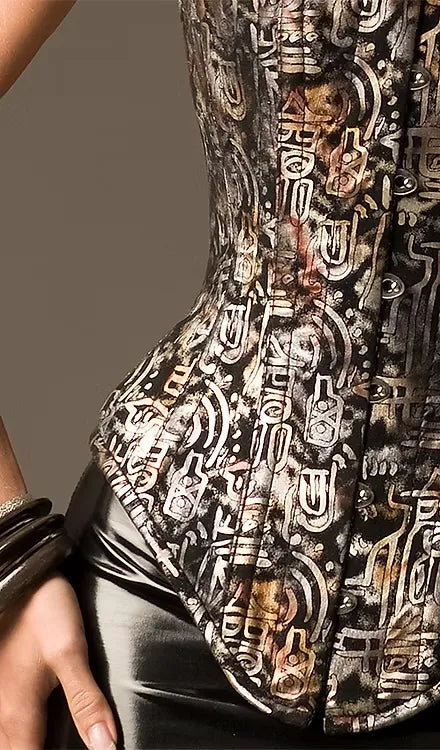 The Corset is made from the finest quality of Print on fully rainforced cotton twill lined and steel boned. The corset has steel, spiral and 4 rigid bones around the grommets in the back for reinforcement for tighter lacing.